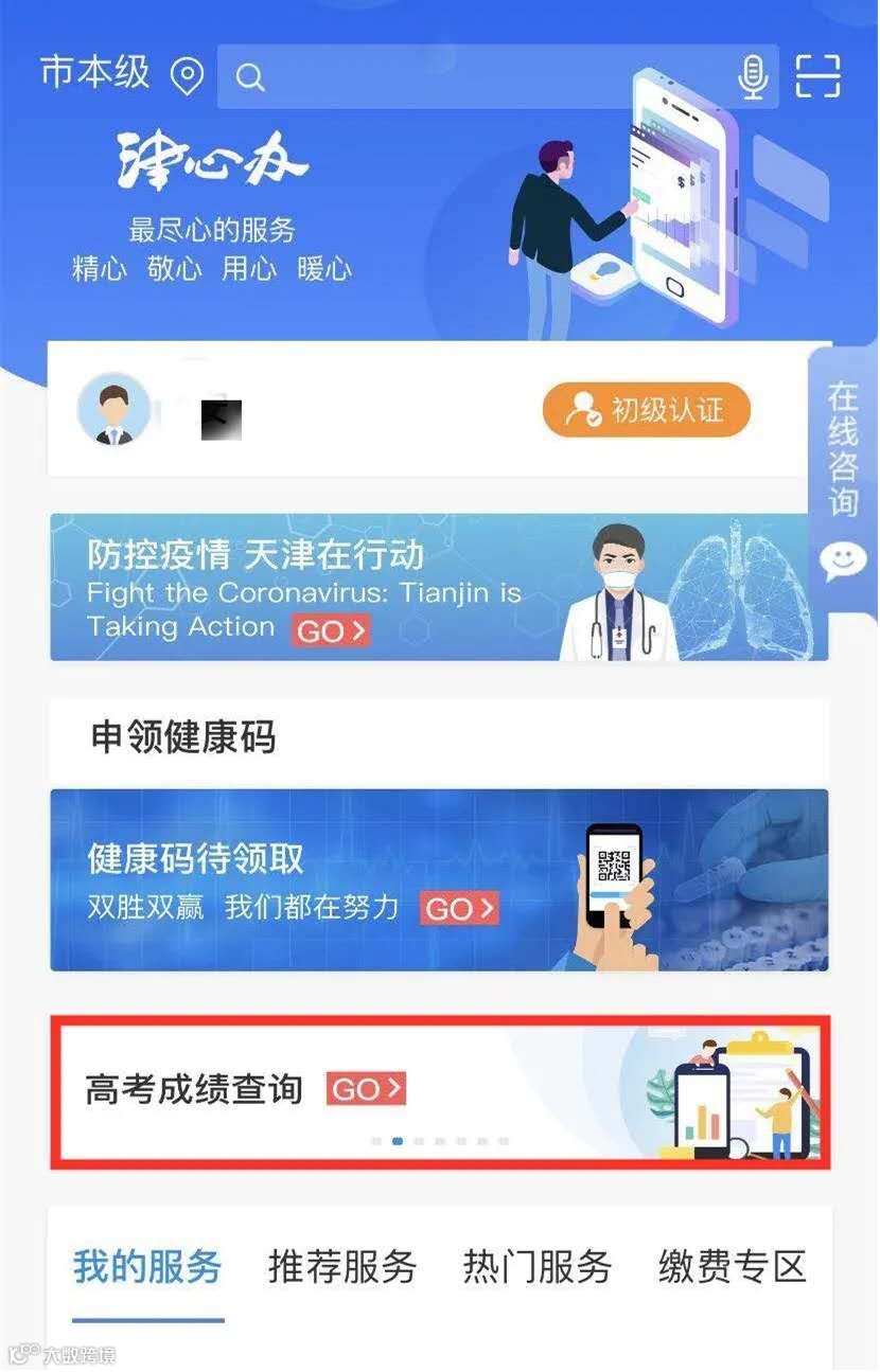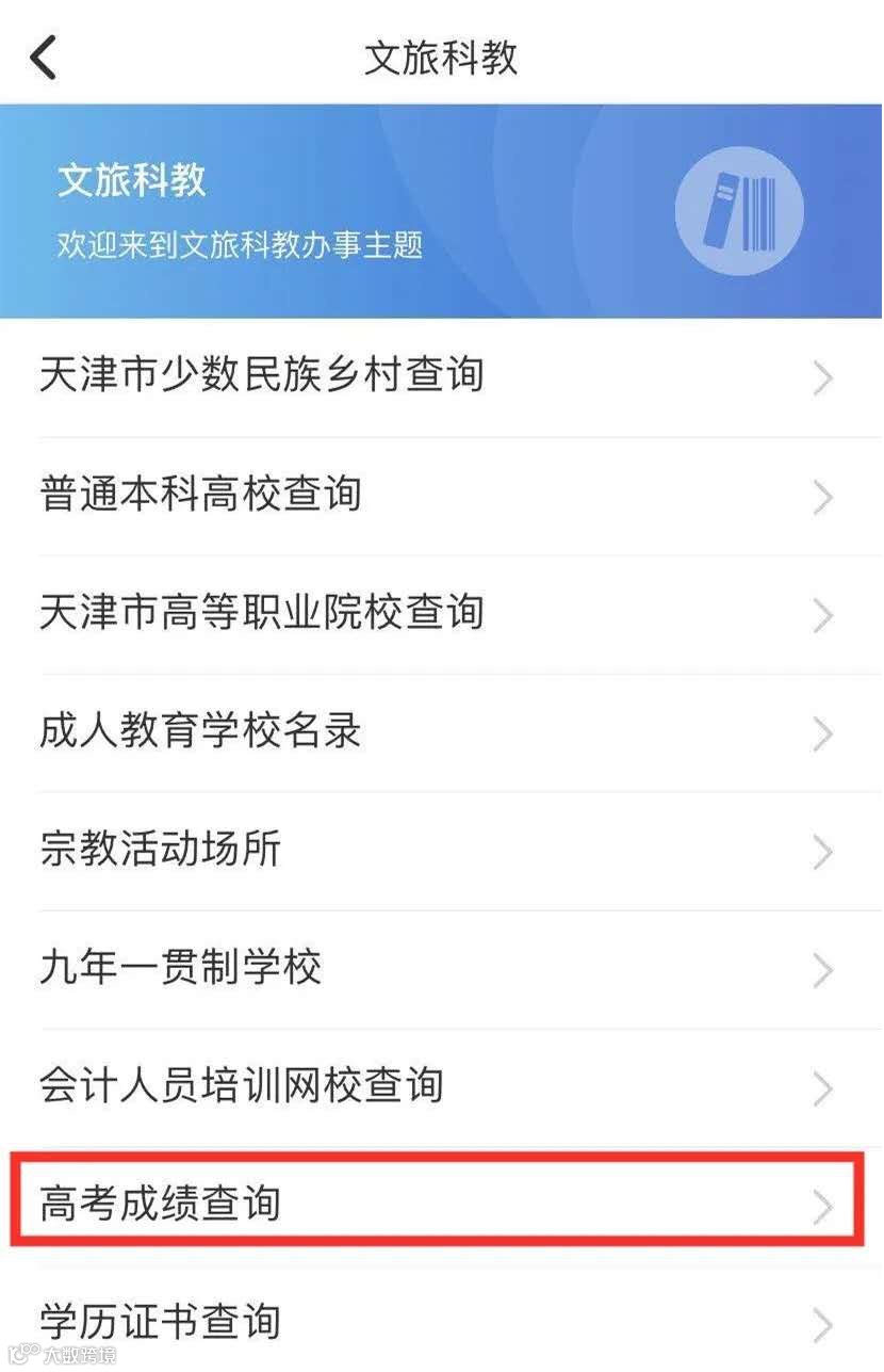 平台(www.gjzwfw.gov.cn),点击“高考成绩查询”服务,在天津政务窗口查询。