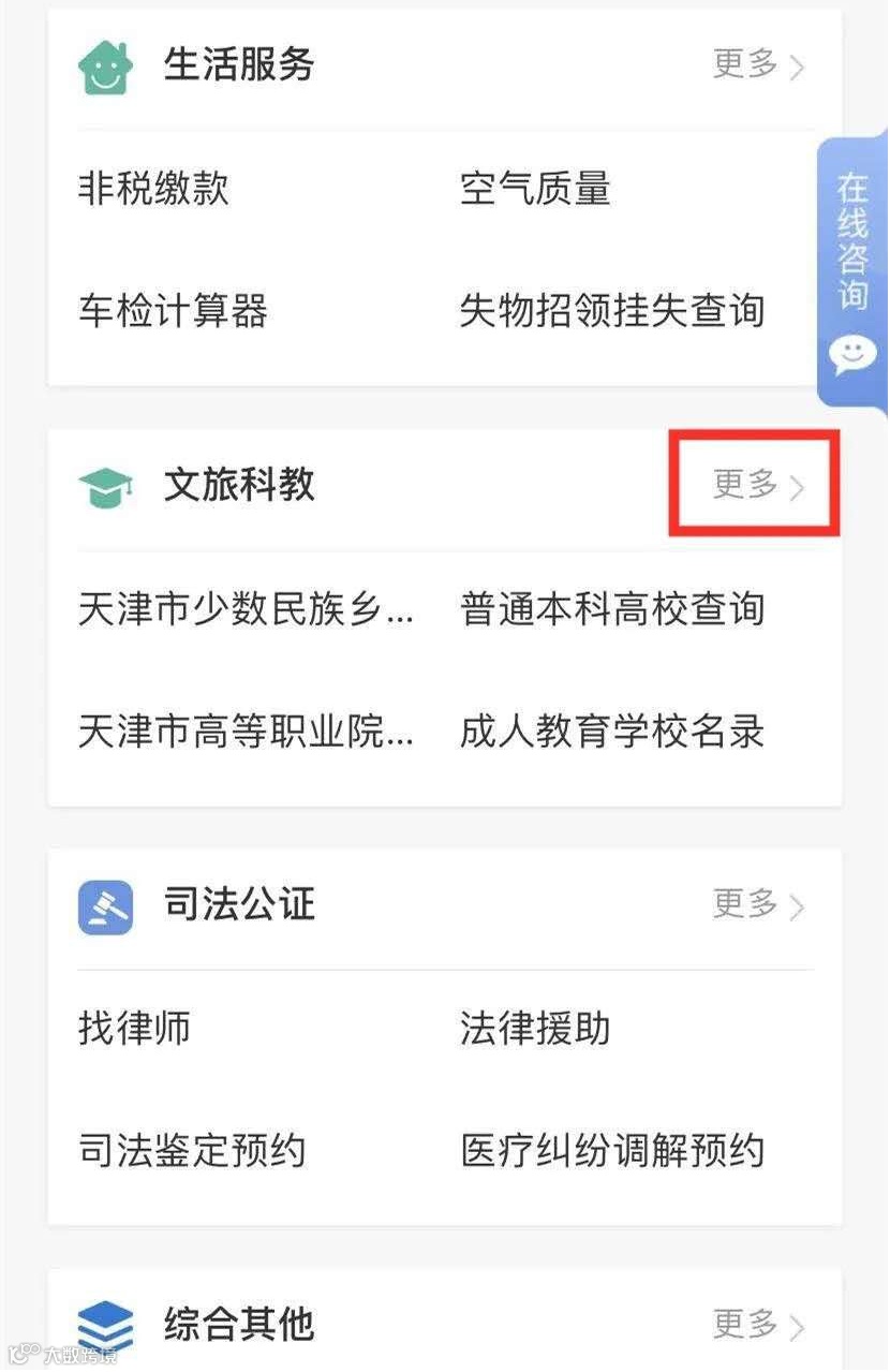 3.登录“津心办”APP、“津心办”支付宝小程序、“津心办”微信小程序任意一端,在首页点击“高考成绩查询”专区,在“文旅科教”服务中找到功能查询入口,进入查询页面。