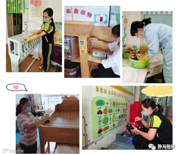 同时,全体教职工在开园前对幼儿园室内外进行了全面、科学、细致的清洁消毒,竭力做到环境卫生不留死角,清洁消毒不留空白,确保幼儿返园后有一个安全的生活、游戏环境。