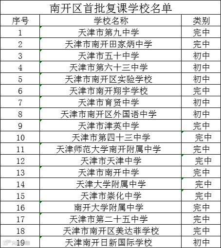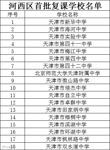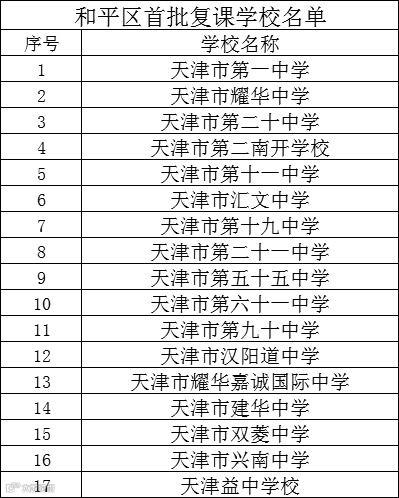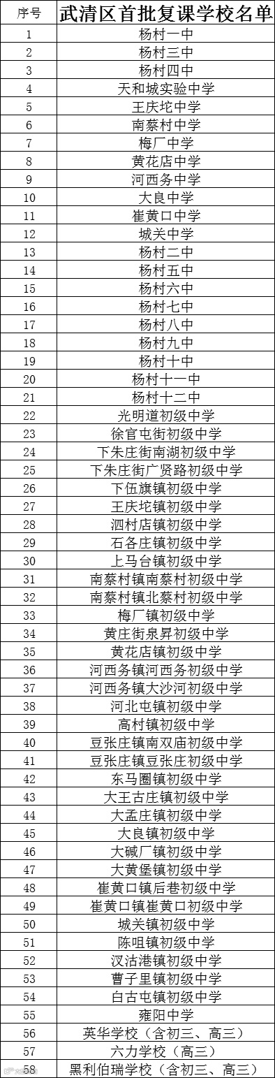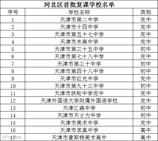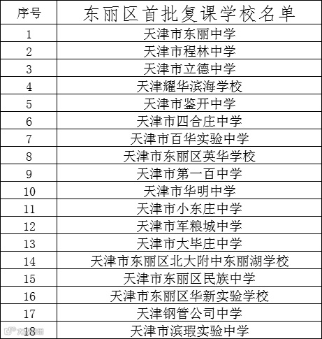 唐官屯镇政府日前,市疫情防控工作指挥部面向社会发布了“关于2020年春季学期学校复课开学的通告”。4月20日,全市初中、普通高中毕业年级同步复课开学,开始正常上课。快来看看各区发布的首批复课开学的学校有哪些吧!