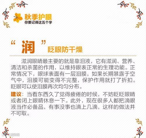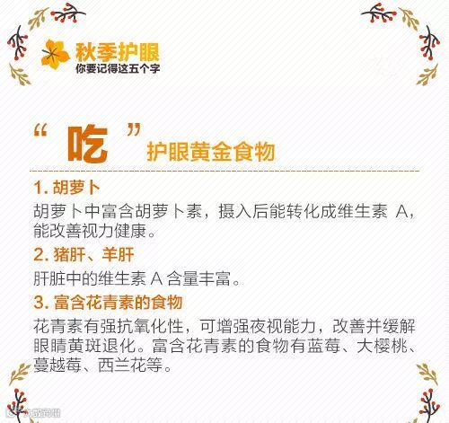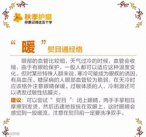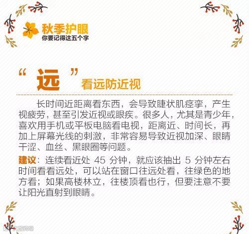 秋季气温逐渐下降,天气也越来越干燥,眼睛更容易受到侵袭。除了做些网络上恢复视力的最佳运动,还要记住这几个字:远—连续看近处,记得眺望远方;动—经常转动眼球缓解疲劳;暖—注意眼睛保暖,可以尝试双手“熨目”;润—经常眨眼防干燥;吃—多吃益眼食物!