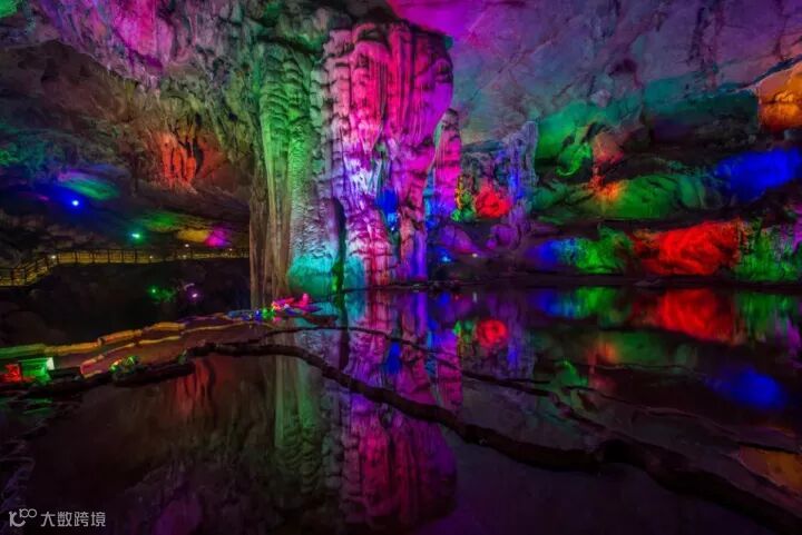 水汽散成雾积聚在洞内,明暗间薄雾环绕,千姿百态的乳石,配着绚丽的灯光,丝毫不逊色于张家界的黄龙洞。