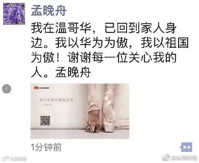 我在温哥华,已回到家人身边,我以华为为傲,我以祖国为傲!谢谢每一位关心我的人。