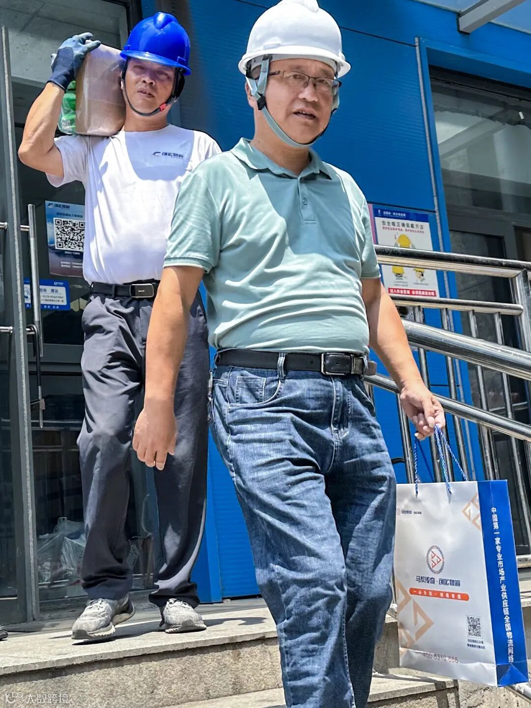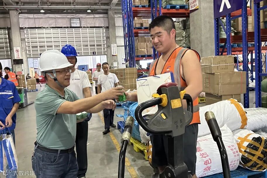 创运物流工会主席金毅群为员工送去清凉物品,包括毛巾、水壶、雨伞等,并叮嘱他们要注意健康,合理安排高温工作时间,防范高温中暑的风险。