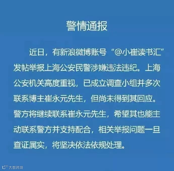 今天,上海警方回应小崔,称暂时没有联系到小崔,希望小崔配合,如果发现违法违纪现象,将会依法依规严肃处理。