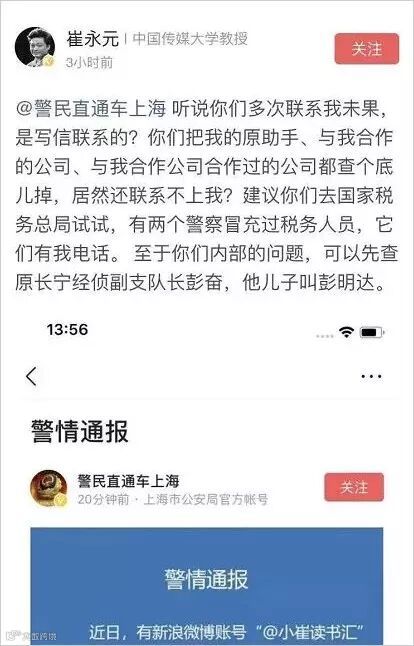就在上海警方呼应之后,小崔随即在网上隔空发炮,怒怼上海警方无法联系到小崔的说法,并且指名道姓的举报上海长宁经侦支队的副支队长彭奋,
