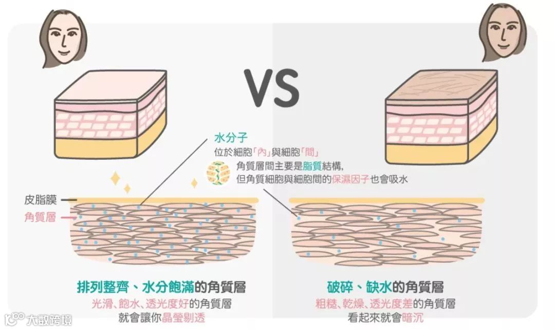 皮肤缺水后,角质层透明度就会降低,降低皮肤对光的反射能力,皮肤自然就变得粗糙、暗沉。