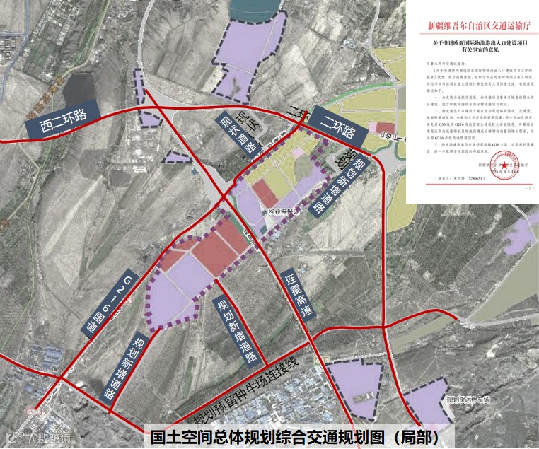 城南国际商贸物流港地处乌鲁木齐市西南门户,北接二环快速路,东临城镇开发边界,南靠G216国道。周边主要对外交通道路包括乌奎高速、G216国道、二环快速路、西绕城高速等,实现了与全疆各地的高速连通。