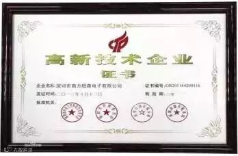 2013年10月获得深圳市科技工贸和信息化委员会颁发的“高新技术企业证书”