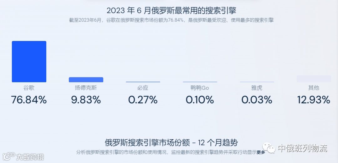 截至2023年6月,谷歌在俄罗斯搜索市场份额为76.84%,是俄罗斯最受欢迎、使用最多的搜索引擎。