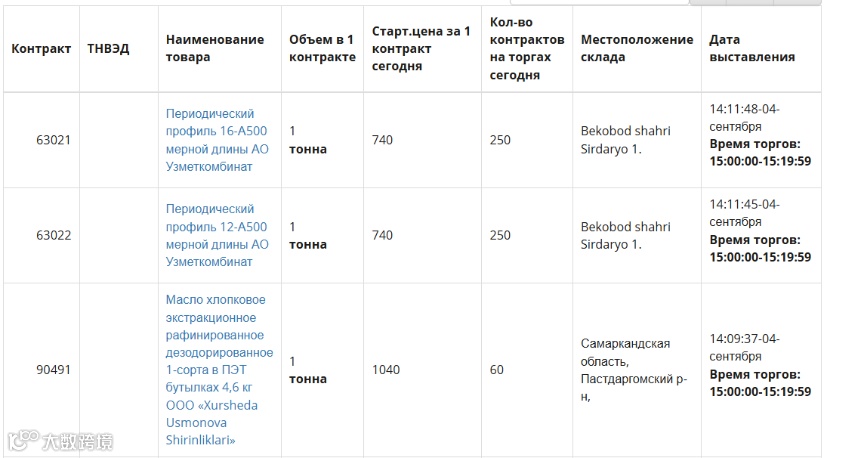 2024年9月12日乌兹别克斯坦国家原料商品交易所挂单信息