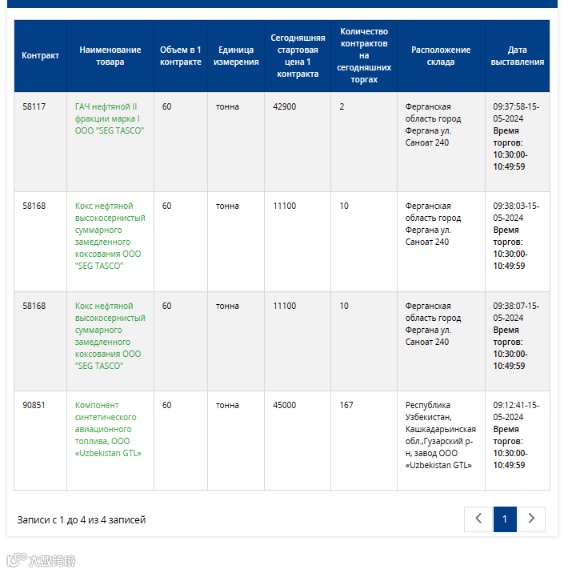2024年5月15日乌兹别克斯坦国家原料商品交易所挂单信息