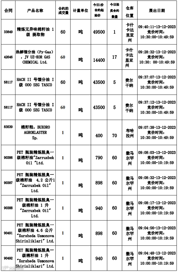 2023年12月13日乌兹别克斯坦国家原料商品交易所挂单信息