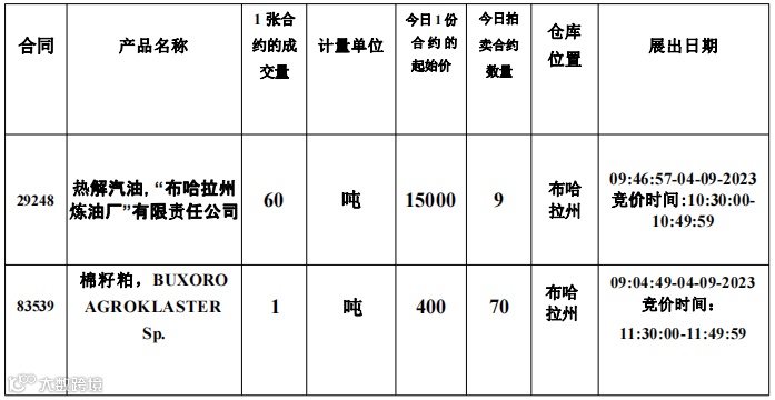2023年9月4日乌兹别克斯坦国家原料商品交易所挂单信息