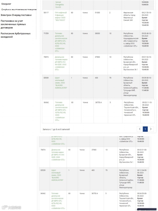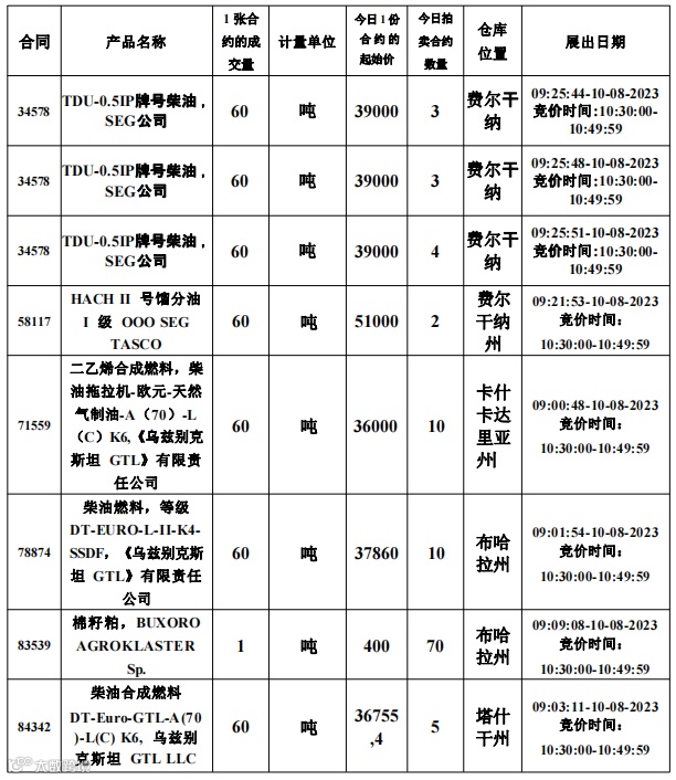 2023年8月10日乌兹别克斯坦国家原料商品交易所挂单信息