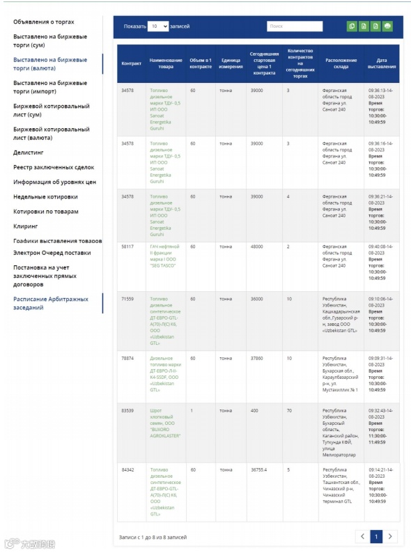 2023年8月14日乌兹别克斯坦国家原料商品交易所挂单信息