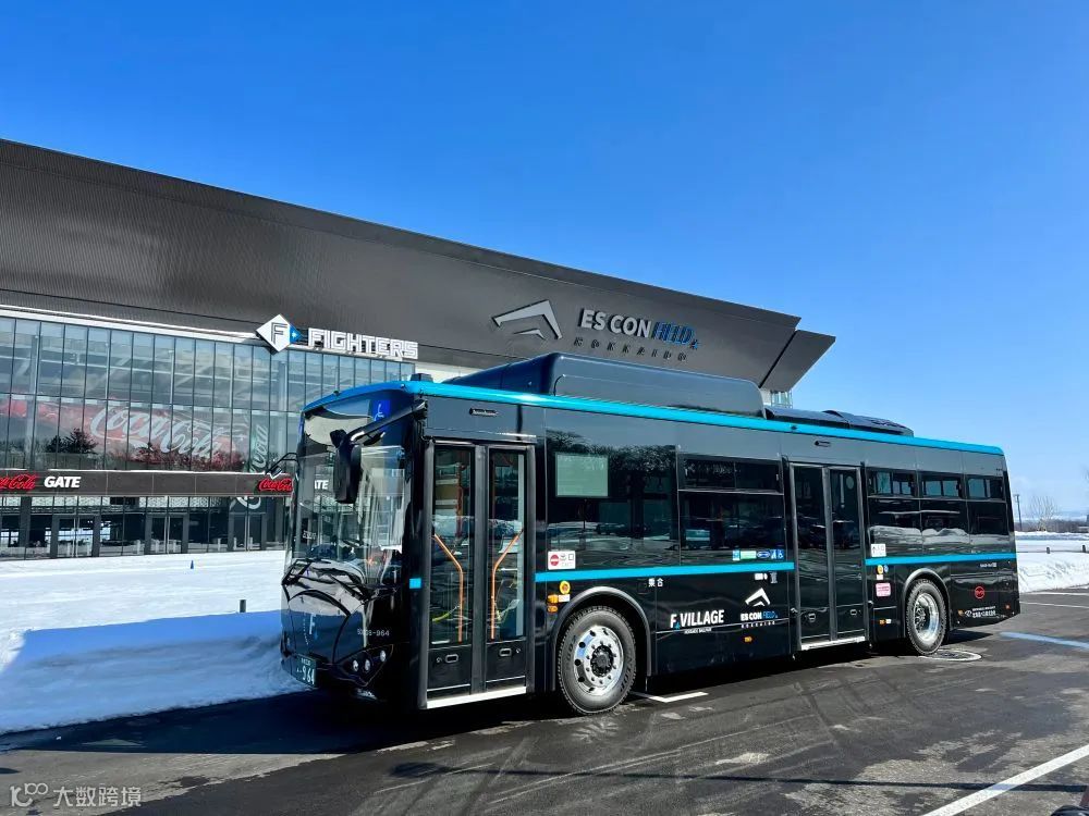 ▲ 2月24日,在日本北海道北广岛市,比亚迪电动大巴停在北海道日本火腿斗士队主场棒球场前。新华社记者姜俏梅摄