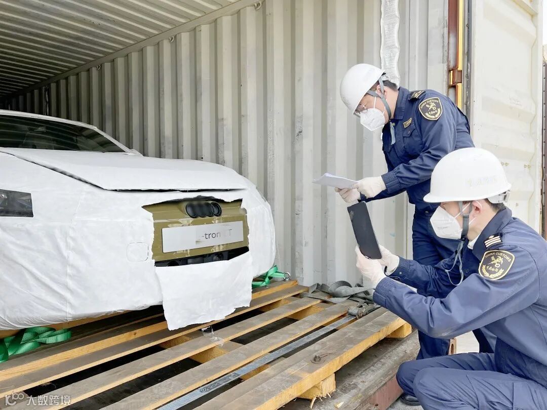 上海洋山海关关员对车展首批进境整车进行监管。王宁/摄