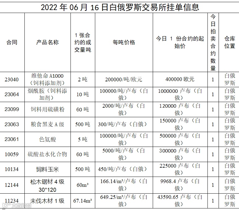 2022年06月16日白俄罗斯交易所挂单信息