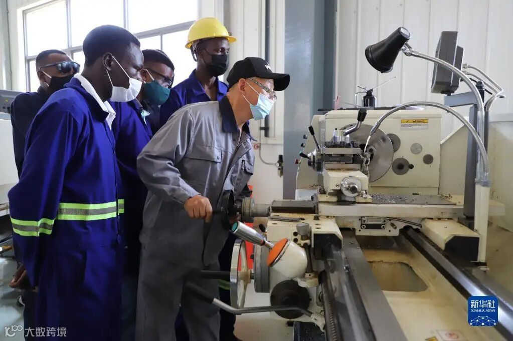 ▲ 2021年11月9日,在位于乌干达中部穆科诺地区纳曼韦工业园的中国援乌工业技能培训与生产中心,一名中方导师为学员演示如何操作机械。新华社记者 张改萍 摄