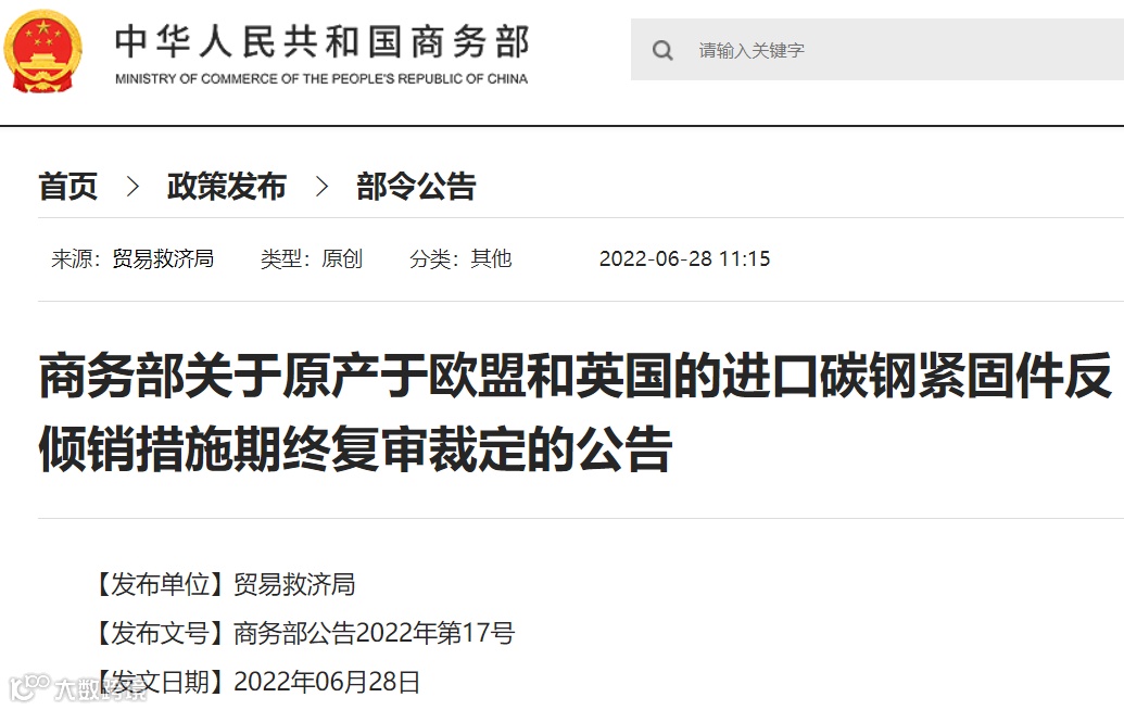 2021年6月28日,应中国碳钢紧固件产业申请,商务部发布2021年第14号公告,决定自2021年6月29日起,对原产于欧盟和英国的进口碳钢紧固件所适用的反倾销措施进行期终复审调查。