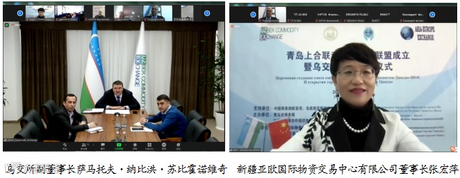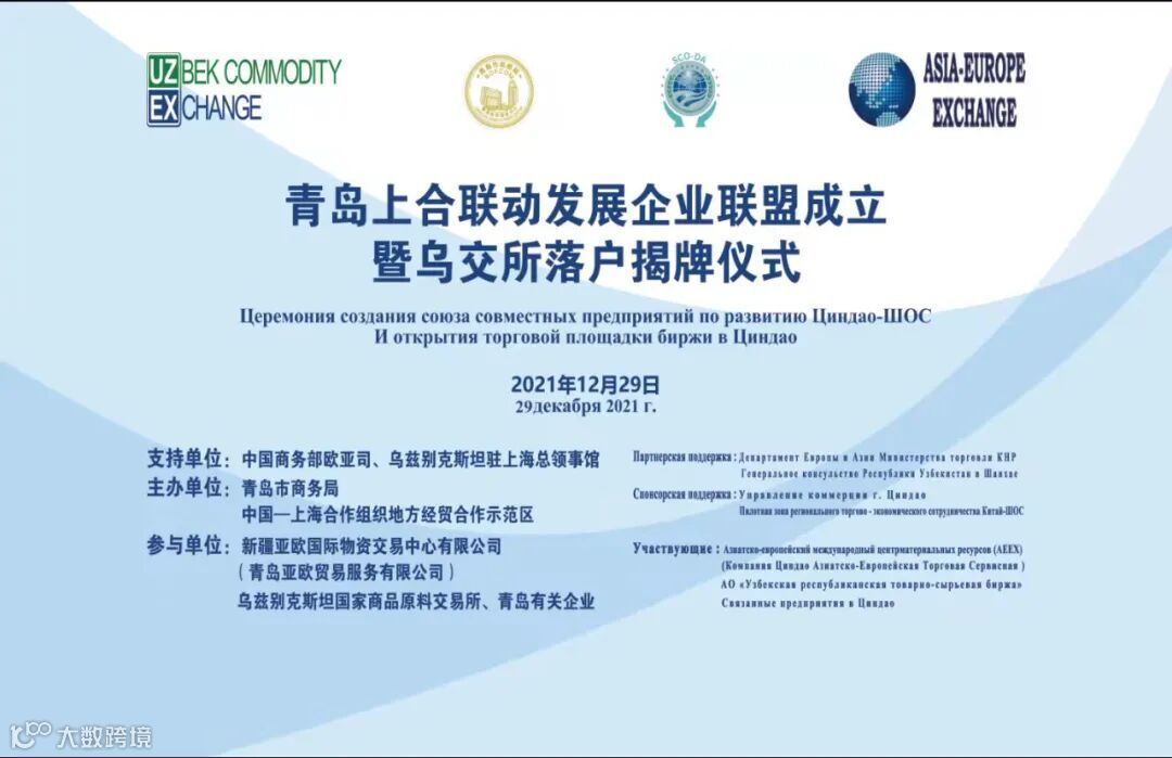2021年12月29日,在中国商务部欧亚司、乌兹别克斯坦驻上海总领事馆的支持下,由青岛市商务局、中国-上海合作组织地方经贸合作示范区主办,新疆亚欧国际物资交易中心有限公司(青岛亚欧贸易服务有限公司)承办的青岛上合联动发展企业联盟成立暨乌交所落户揭牌仪式以线上线下相结合的方式在山东青岛市及各分会场成功举行。