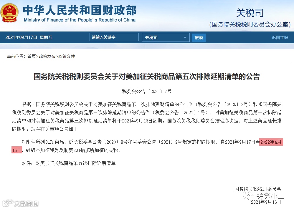 2021年9月16日,国务院关税税则委员会公布对美加征关税商品第五次排除延期清单,对《国务院关税税则委员会关于对美加征关税商品第一次排除延期清单的公告》(税委会公告〔2020〕8号)和《国务院关税税则委员会关于对美加征关税商品第三次排除延期清单的公告》(税委会公告〔2021〕2号)中的81项商品,延长排除期限,自2021年9月17日至2022年4月16日,继续不加征我为反制美301措施所加征的关税。