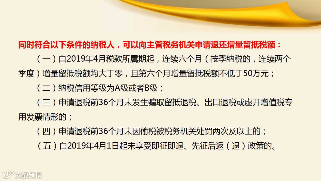(一)自2019年4月税款所属期起,连续六个月(按季纳税的,连续两个季度)增量留抵税额均大于零,且第六个月增量留抵税额不低于50万元;