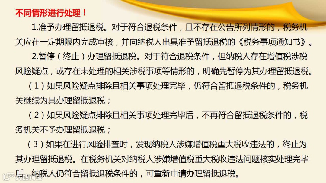 2.暂停(终止)办理留抵退税。对于符合退税条件,但纳税人存在增值税涉税风险疑点,或存在未处理的相关涉税事项等情形的,明确先暂停为其办理留抵退税。