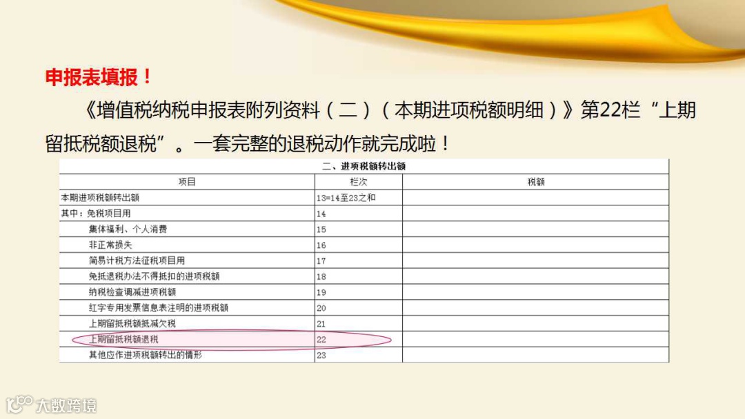 税务机关审核确认后,纳税人应在收到税务机关准予留抵退税的《税务事项通知书》当期,按照税务机关核准的允许退还的增量留抵税额,冲减期末留抵税额,并在办理增值税纳税申报时,相应填写《增值税纳税申报表附列资料(二)(本期进项税额明细)》第22栏“上期留抵税额退税”。一套完整的退税动作就完成啦!