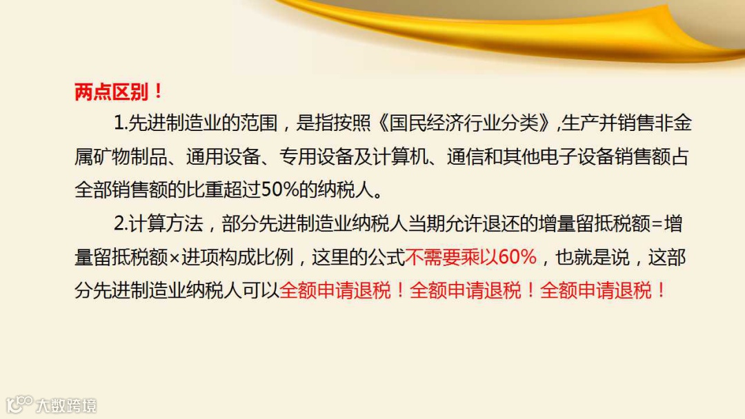 二是计算方法,部分先进制造业纳税人当期允许退还的增量留抵税额=增量留抵税额×进项构成比例,这里的公式不需要乘以60%,也就是说,这部分先进制造业纳税人可以全额申请退税。