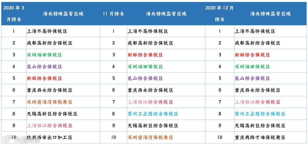 对比11月份的排名,深圳前海湾保税港区(目前已升级为“深圳前海综合保税区”,下称“前海综保区”)掉出前10名,原来排在11位的重庆两路寸滩保税港区(已升级为“重庆两路寸滩综合保税区”)赶超前海综保区跻身前10,排在前9名的海关特殊监管区域名次没有变化。