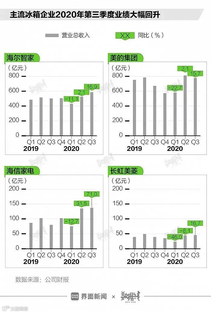 随着市场逐渐复苏,海尔、美的等主要冰箱企业第三季度收入均实现回升,增幅均为两位数。海信家电2020年第三季度营业收入同比增长71%,为4家企业中最高。
