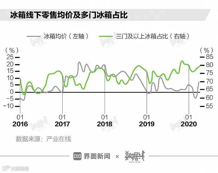 数据显示,冰箱线下零售均价在2019年有所降低,2020年又逐渐上升。同时,多门冰箱的销量占比整体呈现上升趋势。