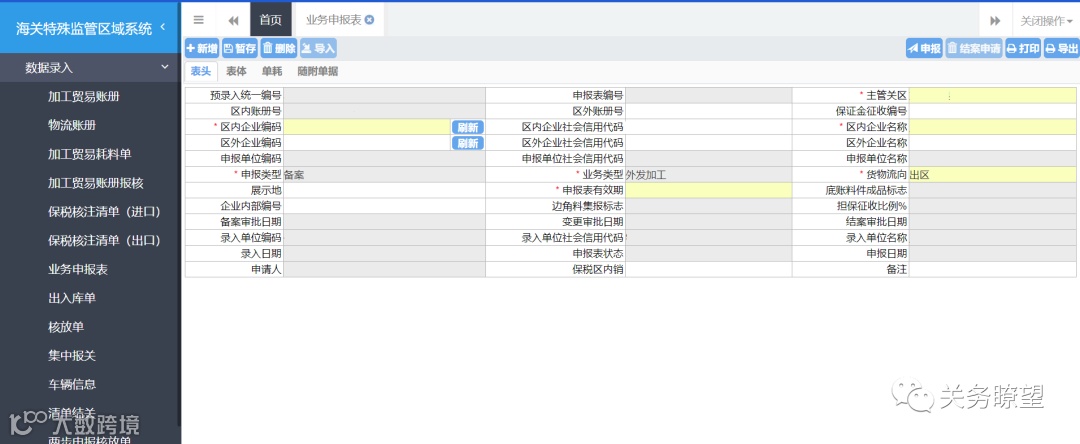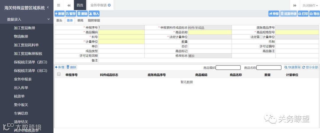 7)业务申报表表头的“底账料件成品标志”字段,是对于与账册底帐关联的业务,填写申报表表体属于账册中的料件或成品