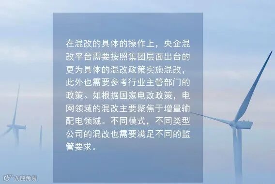 《混改意见》最大的一个亮点就是分类地规定了混改推进的要求:对于主业处于充分竞争行业和领域的商业类国企混合所有制改革,应充分运用整体上市等方式,积极引入其他国有资本或各类非国有资本以实现股权多元化;对主业处于关系国家安全、国民经济命脉的重要行业和关键领域、主要承担重大专项任务的商业类国企,保持国有资本控股地位,支持非国有资本参股;对自然垄断行业,实行以政企分开、政资分开、特 许经营、政府监管为主要内容的改革,根据不同行业特点实行 网运分开、放开竞争性业务,同时根据细分行业的不同,规定 了部分行业非公有资本准入的负面清单;公益类国企则要求根据不同的业务特点,推进具备条件的企业实现投资主体多元 化,鼓励非国企通过购买服务、特许经营、委托代理等形式参