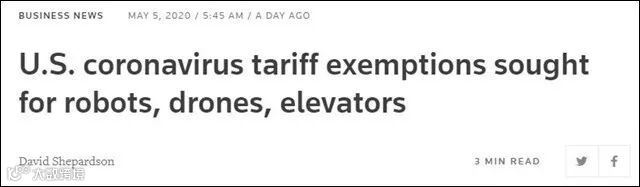 路透社报道截图 “美国新冠关税豁免拓展至机器人、无人机和电梯”