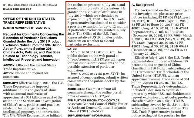 美国贸易代表办公室(USTR)4月30日在美国《联邦公报》上发布公告,对于延长其在2019年7月批准的部分中国产品的关税豁免,征求公众意见。