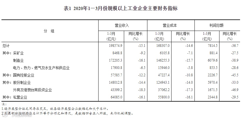 国家统计局:2020年1-3月份全国规模以上工业企业利润下降36.7%(附解读)