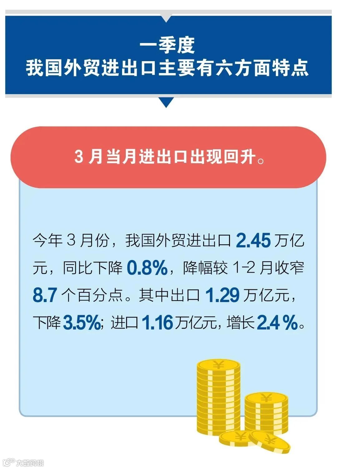今年3月份,我国外贸进出口2.45万亿元,同比下降0.8%,降幅较1-2月收窄8.7个百分点。其中出口1.29万亿元,下降3.5%;进口1.16万亿元,增长2.4%。