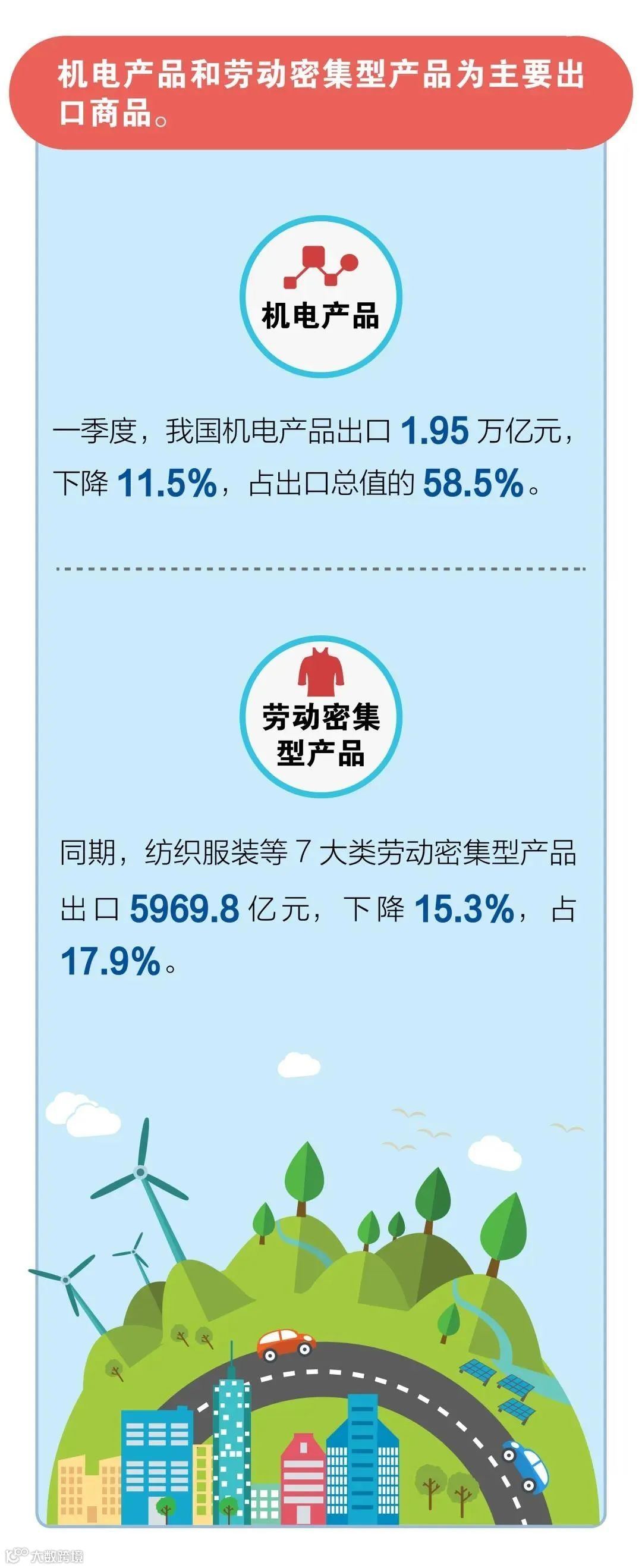 一季度,我国进出口虽然下降了6.4%,但降幅较前2个月明显收窄3.1个百分点,外贸进出口有所回升。