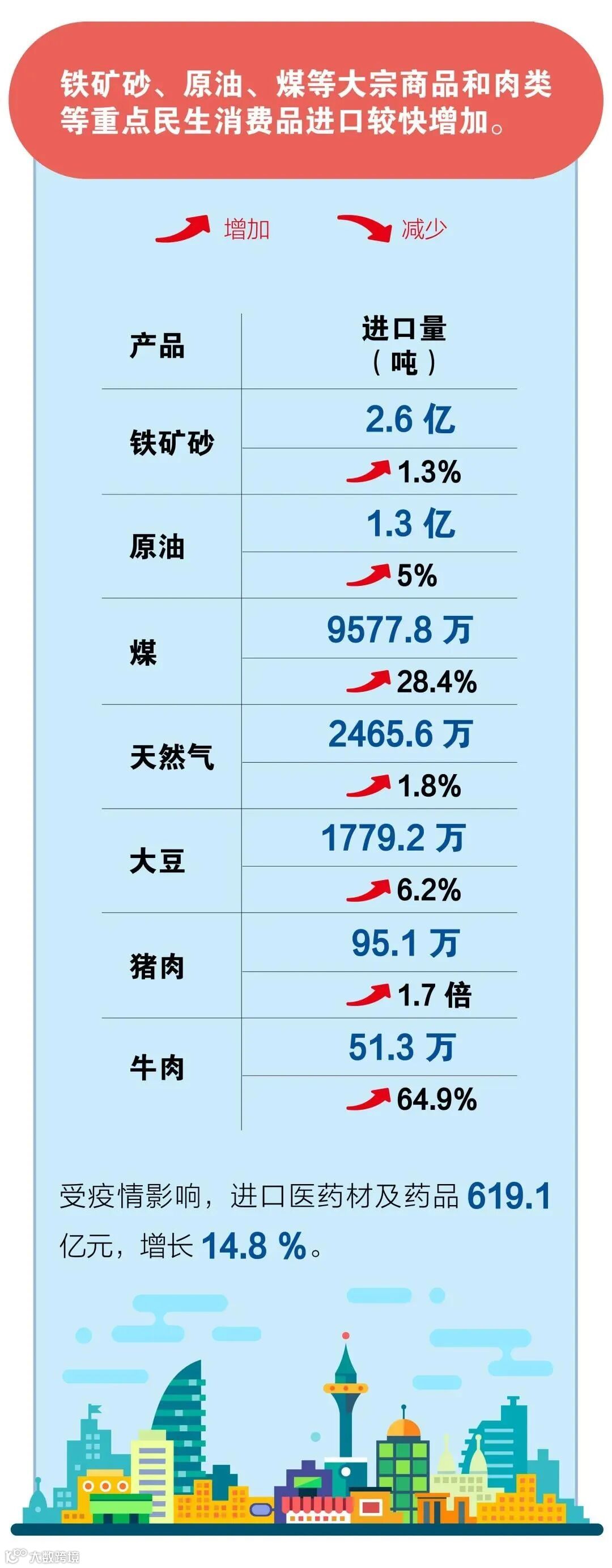 铁矿砂、原油、煤等大宗商品和肉类等重点民生消费品进口较快增加