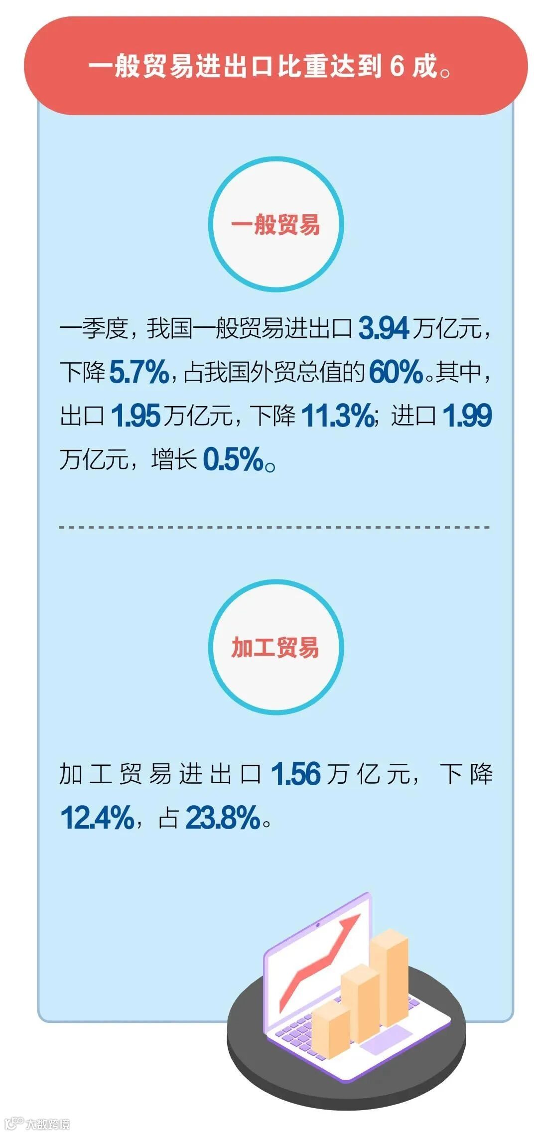 据海关统计,一季度我国货物贸易进出口总值6.57万亿元人民币,比去年同期下降6.4%。其中,出口3.33万亿元,下降11.4%;进口3.24万亿元,下降0.7%;贸易顺差983.3亿元,减少80.6%。