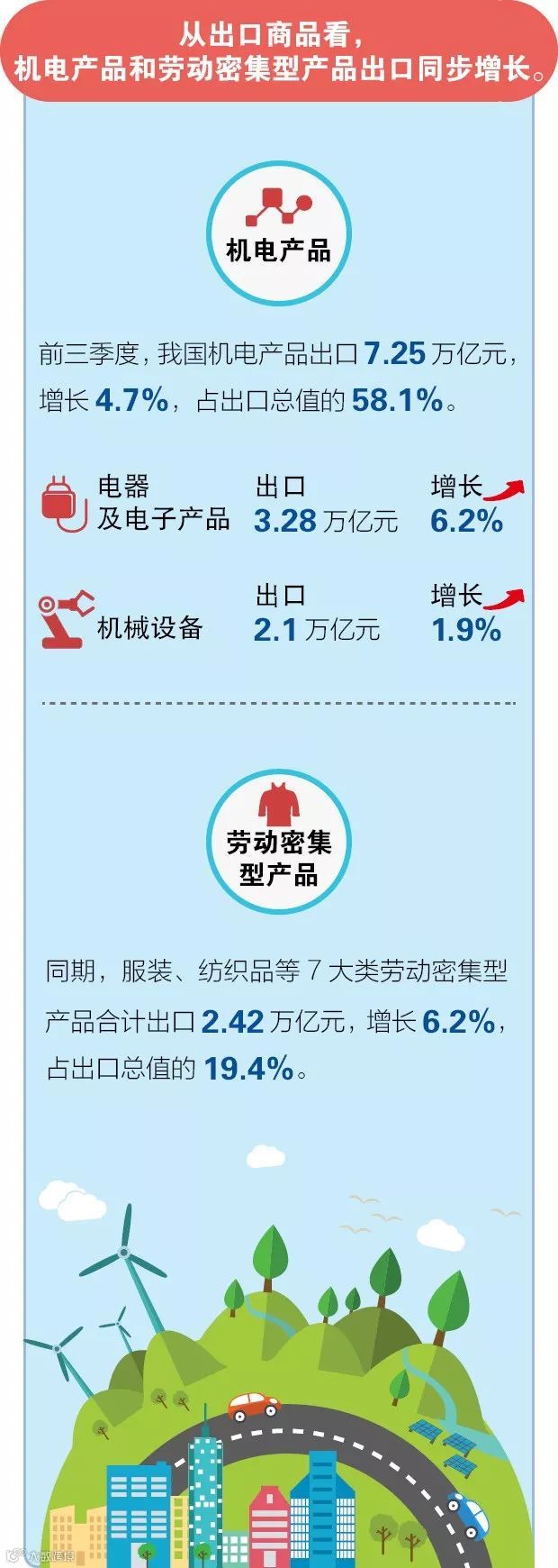 五是进出口商品结构更加优化。今年以来,促进形成强大国内市场系列政策落地实施,内需潜力持续释放,为我国积极扩大进口、优化我国进口商品结构提供内生动力。前三季度,民生消费类产品进口较快增长,更好地满足了人民美好生活需要,如水果、化妆品、水海产品进口分别大幅增长42.3%、39.9%、35.9%,电动载人汽车进口增长93.7%,先进技术设备和关键零部件进口较快增长,如涡轮喷气发动机、自动数据处理设备零件进口分别增长23.2%、14.6%。同时,国内供给侧结构性改革持续推进,产业升级取得积极进展,促进我国出口商品结构持续优化。前三季度,占出口总值近六成的机电产品出口增长4.7%,其中太阳能电池、金属加工机床出口值分别增长55.6%、17.5%。此外,企业加快出口产品品牌建设,前三季度我国出口境内自主品牌商品增长12.9%。谢谢。