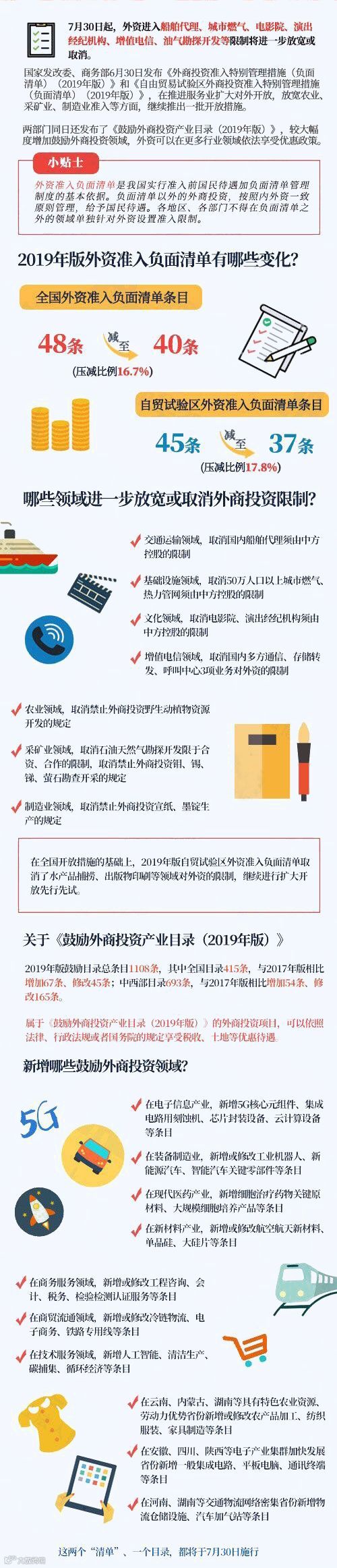 国家发改委、商务部6月30日发布《外商投资准入特别管理措施(负面清单)(2019年版)》、《自由贸易试验区外商投资准入特别管理措施(负面清单)(2019年版)》和《鼓励外商投资产业目录(2019年版)》。