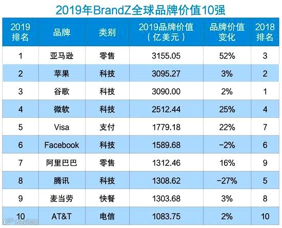 继2018年的榜单上亚马逊品牌价值(2018年第3)同比大涨49%之后,在2019年的榜单上它的品牌价值又增加了52%,达到了3155亿美元,一举超过了温和增长的苹果(第二名,3095亿美元,增长3%)和谷歌(第三名,3090亿美元,增长2%)。
