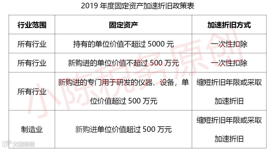 对所有行业企业2019年1月1日后新购进的专门用于研发的仪器、设备,单位价值超过500万元的,可缩短折旧年限或采取加速折旧的方法。