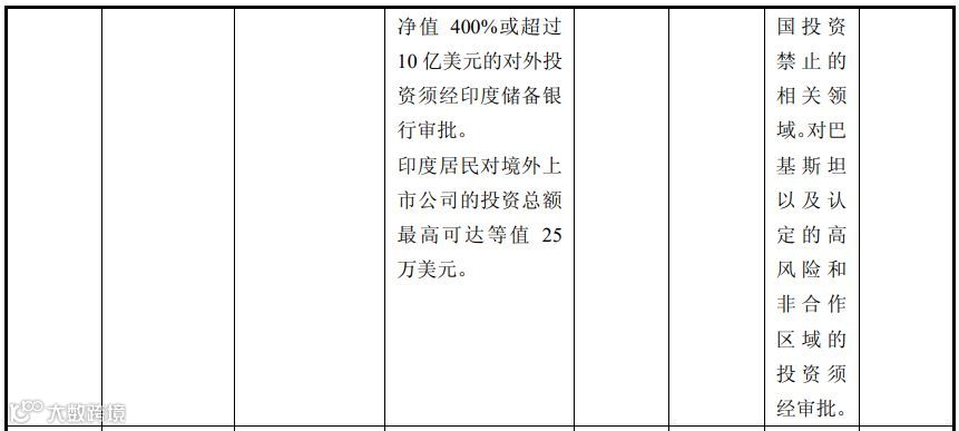直接投资:外商直接投资要符合负面清单(8个行业禁止外商投资)及其他要求。孟加拉国和巴基斯坦注册企业或公民投资须经过外国投资促进委员会审批。限制巴基斯坦投资者进入国防、航空、原子能以及对外国投资禁止的相关领域。房地产交易须经印度储备银行审批。对外直接投资不超过公司净值 400%或不超过10亿美元的无需审批。对巴基斯坦以及外国投资促进委员会认定的高风险和非合作区域的投资须经审批。