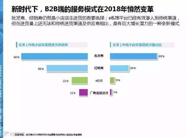 数字化B2B端服务平台如雨后春笋般涌现,全国具有一定规模的就超过50家,必将在2019年展开全新竞争。在当前的传统通路小店中,每个店主都有丰富的进货平台选择,并且有22%的店主选择在B2B平台进货,平均每家店安装的eB2B超过1.5个。