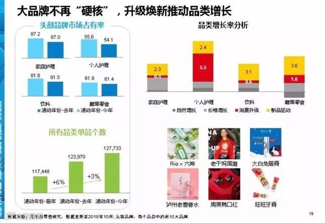 从上图可以看出,无论是家庭护理、个人护理、饮料还是糖果零食,头部品牌的市场份额正在不断被稀释,所有品类的单品个数正在不断攀升。